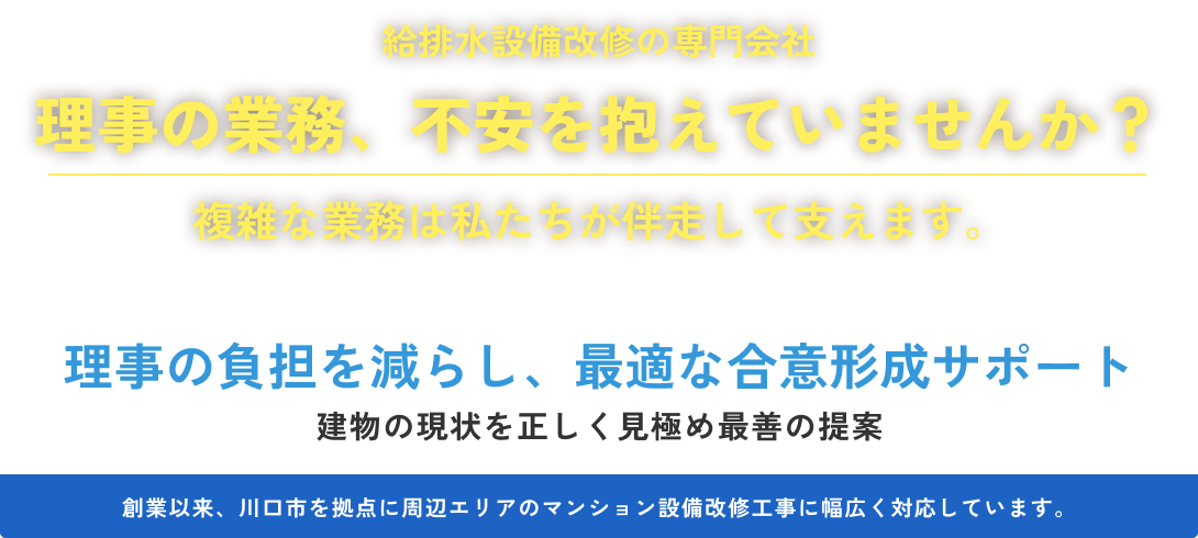 修繕や改修の判断に迷ったとき、皆さまが安心して相談できるパートナーでありたい。創栄は、設備の専門知識と実績を活かし、調査からアフターケアまでトータルでサポート。組合や理事の皆様さまの負担を減らし、無理のない計画と最適な判断をお手伝いします。