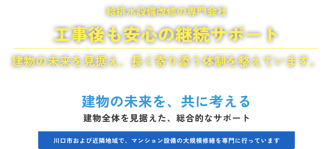 1991年の創業以来、埼玉県を拠点にマンション・ビルの給排水設備工事を専門に行ってきました。建物の調査・設計から工事管理、アフターケアまで、一貫して対応できる体制を備えています。これまでに培った経験とグループの総合力で、安心で快適な暮らしを支え続けています。